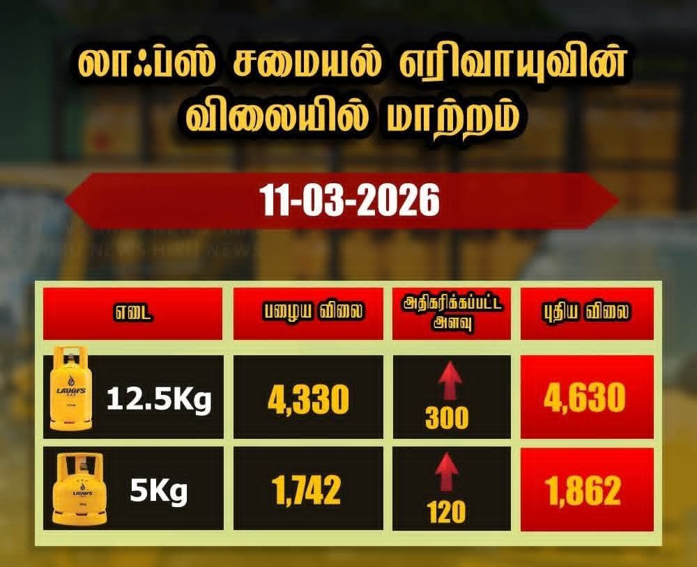 12.5kg எரிவாயு சிலிண்டர் 300 ரூபாவால் அதிகரிக்கப்பட்டு புதிய விலையாக 4630 ரூபாய்க்கு விற்பனை செய்யப்படவுள்ளது.