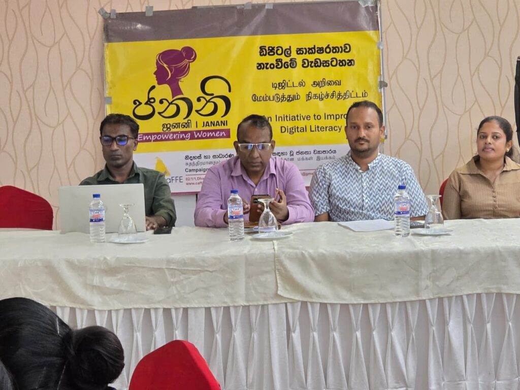 இதில் CaFFE (Campaign for Free and Fair Elections) அமைப்பின் நிறைவேற்று பணிப்பாளர் திரு. மனாஸ் மக்கீன் அவர்கள் முக்கிய வளவாளராகப் பங்கேற்றார். மேலும் PeFFRELL அமைப்பின் நிறைவேற்று பணிப்பாளர் திரு. ரோஹன ஹெட்டியாராச்சி அவர்களும், IRES அமைப்பின் நிறைவேற்றுப் பணிப்பாளர் திரு. மஞ்சுல கஜநாயக்க அவர்களும், CaFFE அமைப்பின் கணக்காளர் திரு. மாலக வித்தானகே அவர்களும் கலந்து கொண்டனர். மேலும், CaFFE அமைப்பின் குருநாகல் மாவட்ட ஒருங்கிணைப்பாளர் திரு. எஸ். சஜாத் அவர்களும், CaFFE அமைப்பின் தென் மாகாண ஒருங்கிணைப்பாளர் திரு. ஜயதிலக அவர்களும் இவ்வேலைத்திட்டதில் கலந்து சிறப்பித்தார். மேலும் மூன்று கட்டங்களை கொண்ட “ஜனனி” வேலைத்திட்டத்தின் இறுதி அமர்வாக அமைந்த இந்த நிகழ்ச்சி, கலந்து கொண்ட அனைத்து பெண் பிரதிநிதிகளுக்கும் சான்றிதழ்கள் வழங்கப்பட்டதன் மூலம் வெற்றிகரமாக நிறைவடைந்தது.