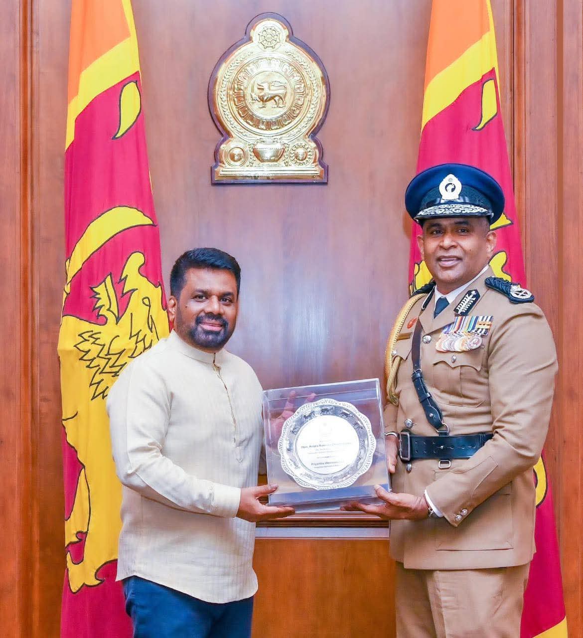 புதிய பொலிஸ் மாஅதிபருக்கு ஜனாதிபதி தனது வாழ்த்துக்களைத்தெரிவித்ததோடு, ஜனாதிபதிக்கு அவர் நினைவுப்பரிசொன்றையும் வழங்கினார்.